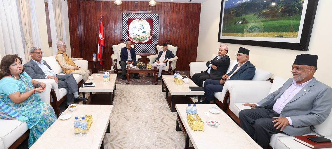 - छलफलमा कांग्रेसबाट सभापति देउवा, उपसभापति पूर्णबहादुर खड्का, मन्त्रीहरू रमेश लेखक, आरजु राणा देउवा र रामनाथ अधिकारी छन्। एमालेबाट वरिष्ठ उपाध्यक्ष ईश्वर पोखरेल र अर्थमन्त्री विष्णु पौडेल छन्। समसामयिक राजनीतिक घटनाक्रमबारे छलफल भइरहेको प्रधानमन्त्रीको सचिवालयले जनाएको छ।