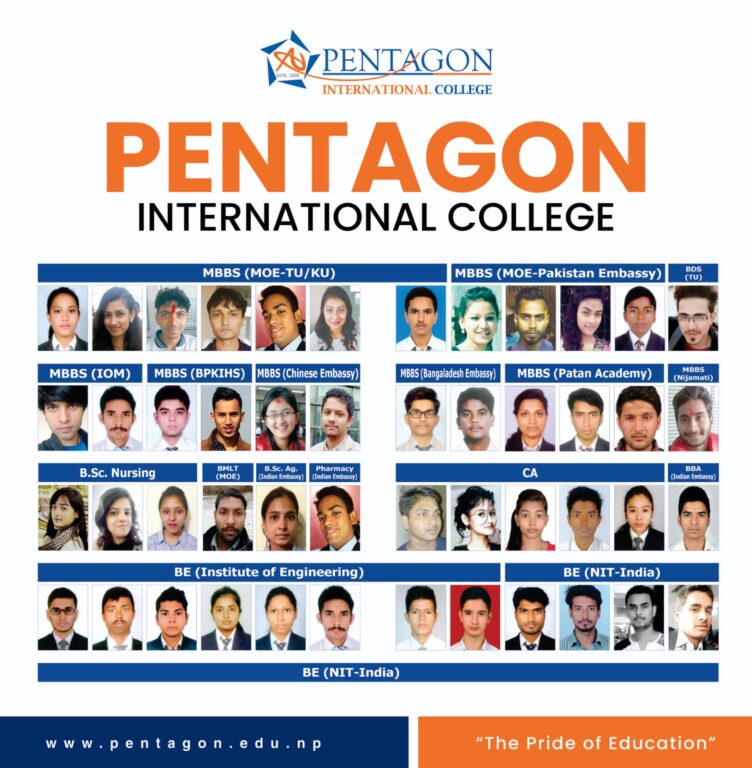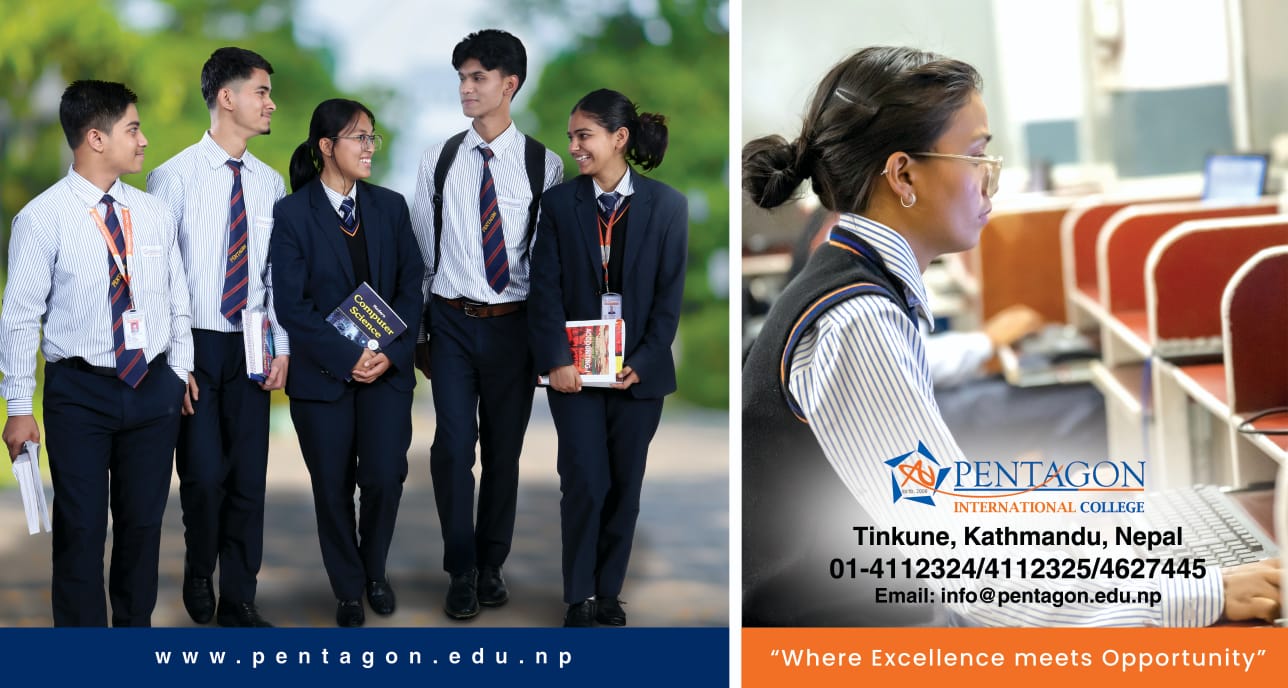 काठमाडौं । २०६६ सालमा स्थापित भएको पेन्टागन इन्टरनेशनल कलेज उच्च शिक्षाको क्षेत्रमा ख्याति प्राप्त, अनुभवी तथा विशुद्ध प्राज्ञिक व्यक्तिहरूको समूहबाट सञ्चालित कलेज हो । यस कलेज स्थापना कालदेखि नै विद्यार्थी तथा अभिभावकहरूको पहिलो रोजाईमा परेको छ ।