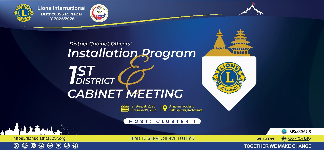 काठमाडौँ । लायन्स अन्तर्राष्ट्रिय जिल्ला ३२५–आर अन्तर्गतको पहिलो क्याबिनेट बैठक आउँदाे शनिबार १७ गते अनुपम फुडल्याण्ड, बत्तीसपुतली, काठमाडौँमा आयोजना हुँदै छ। उक्त कार्यक्रम जिल्ला गभर्नर पीएमजेएफ लायन नवराज सापकोटाको अध्यक्षतामा सञ्चालन हुनेछ।
